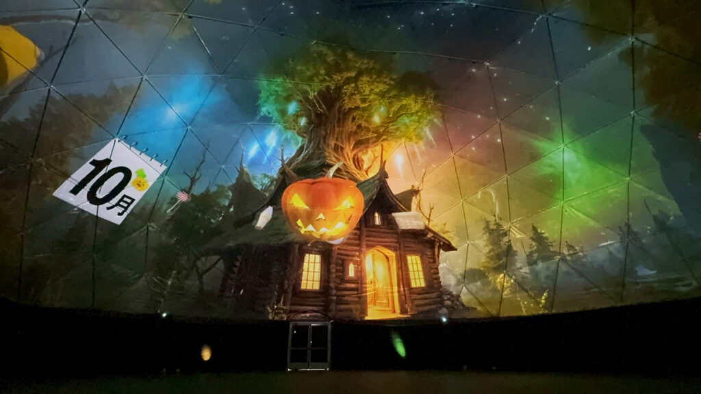 プリズムはメイン会場である旭川市道北アークス大雪アリーナ内に、シンボル展示スペースとなった大小2つのホワイトロックドームを設置。36ftのドーム内では折り鶴のインスタレーションを、70ftのメインドームでは菓子にまつわるプロジェクションマッピングを全天周で展開しました。