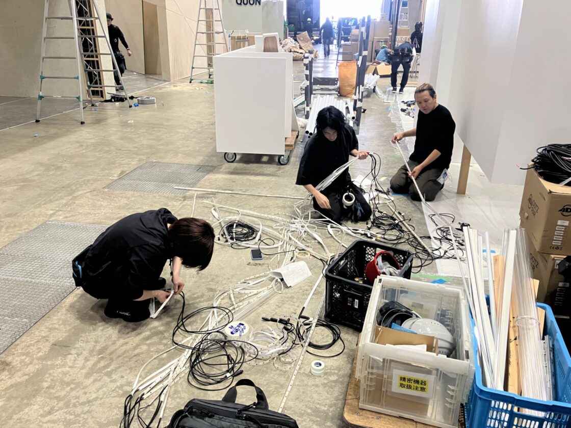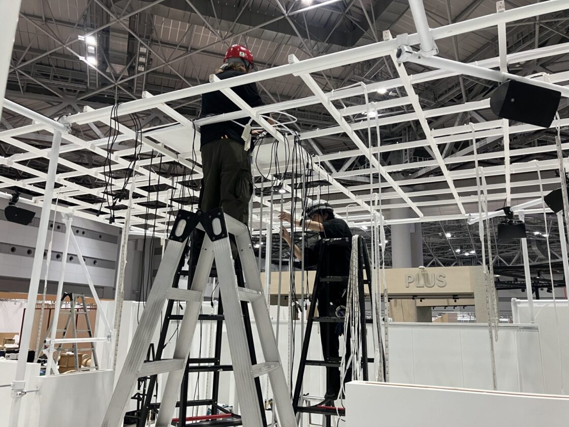 その中でプリズムは、間仕切りで新たな価値を創造する間づくりカンパニー、コマニー株式会社のブースにおけるテクニカル面の施工を主に担当しました。初回から毎年関わっており、今回で4回目の参加となります。